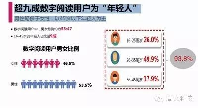 超九成数字阅读用户为年轻人,男性略多于女性,以45岁以下年轻人为主,数字阅读用户中,男女比例约为53:47。